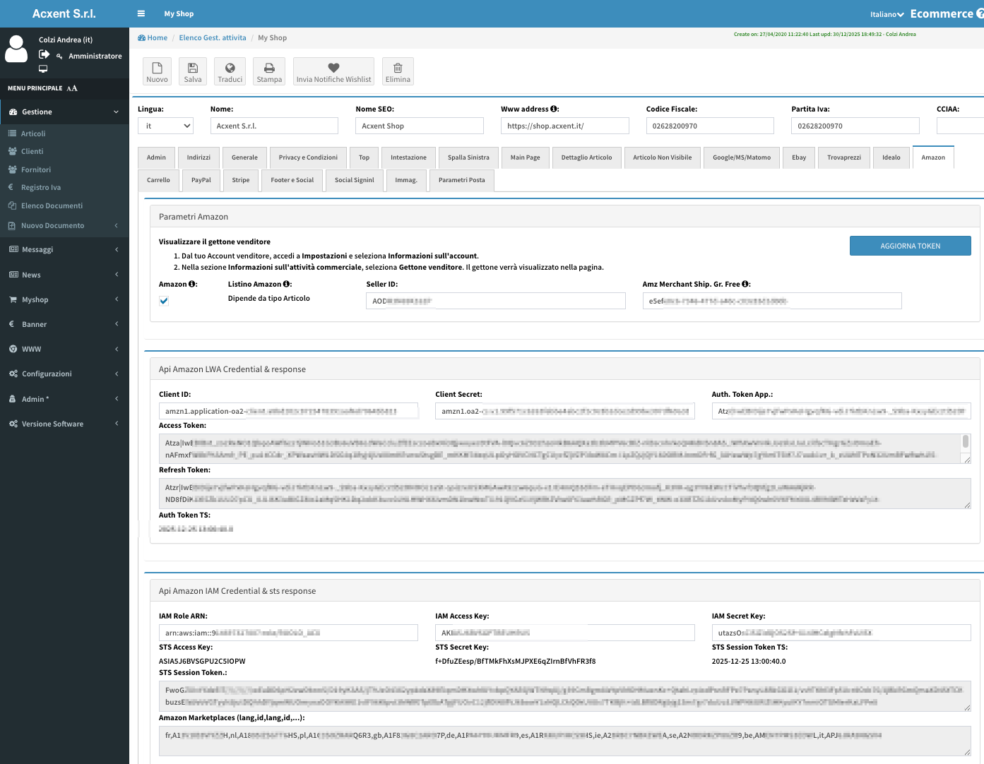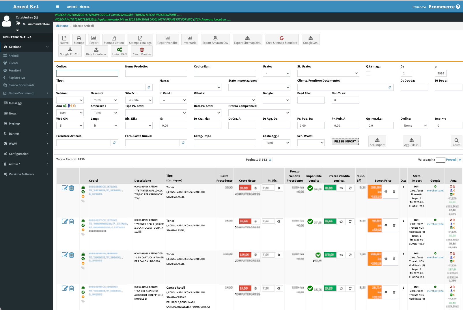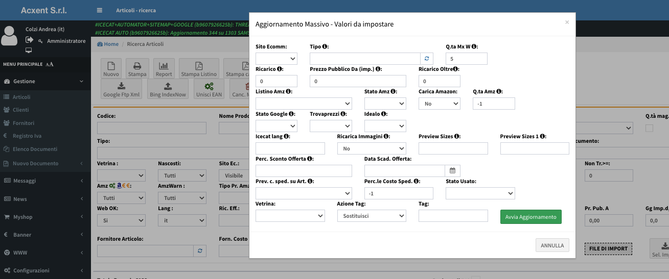 Un pannello dedicato permette aggiornamenti massivi (schede tecniche, prezzi, sconti, spese di spedizione) da file esterni.