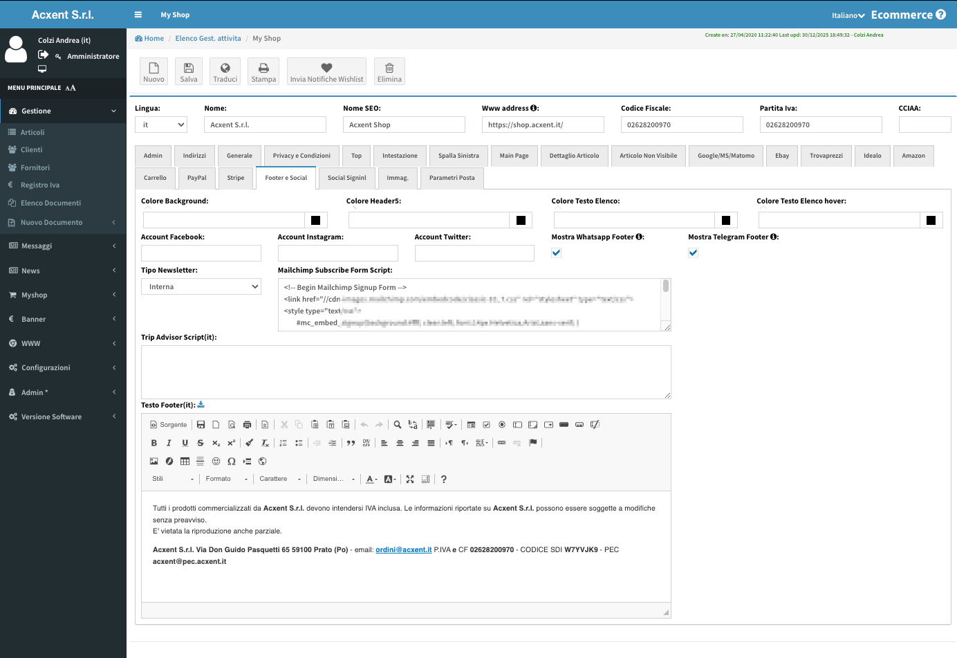 Puoi decidere modalità di checkout, attivare o meno il pagamento online, collegare social e mailing list (es. Mailchimp), gestire banner, coupon, lingue e valute disponibili.