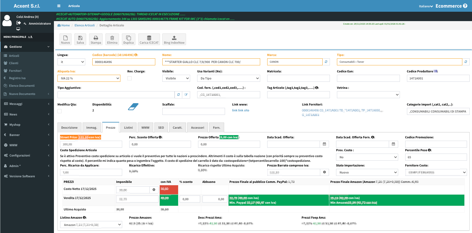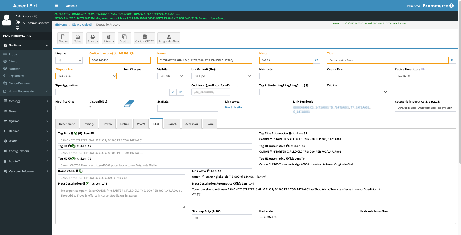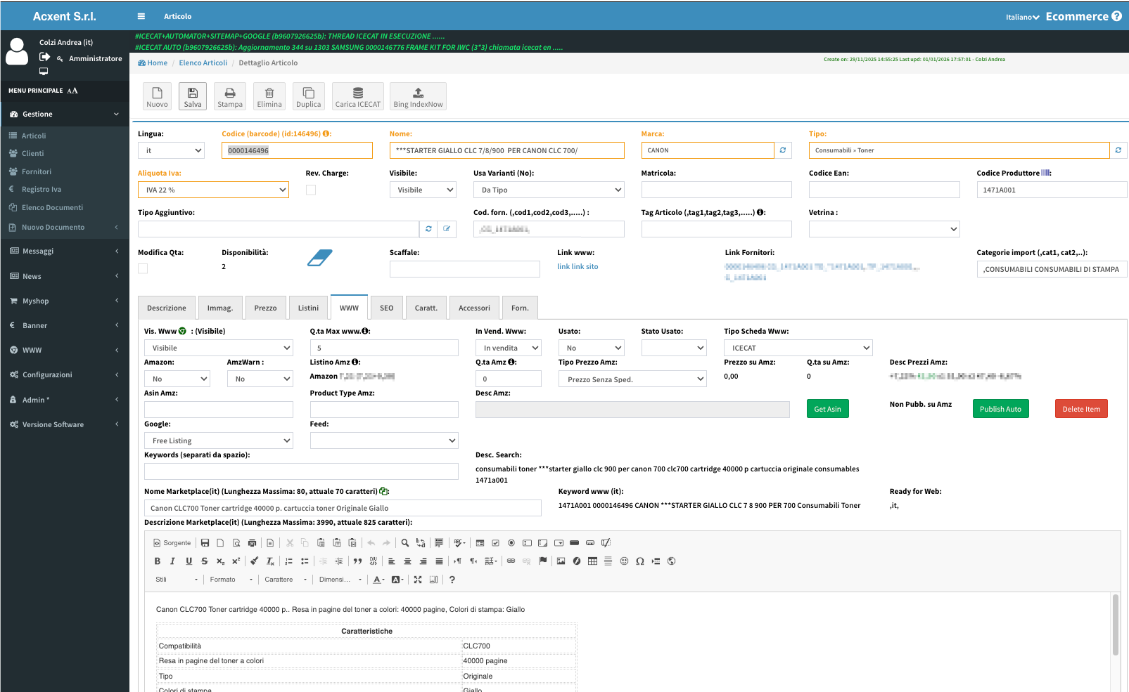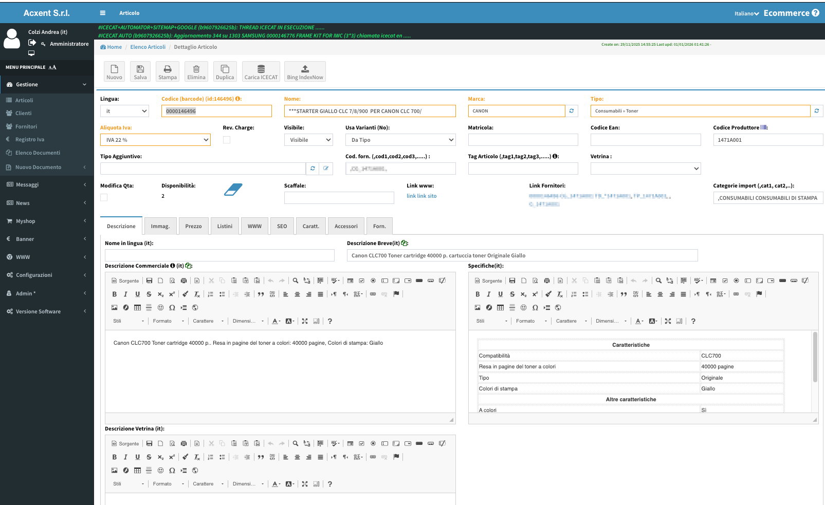 – caricare automaticamente schede tecniche tramite ICECAT (se hai l’abbonamento), inserendo solo i parametri di accesso.