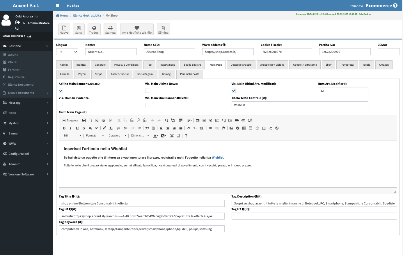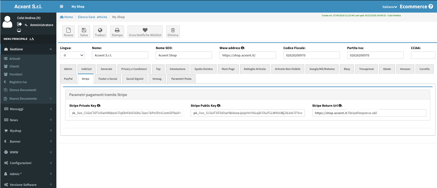 Puoi decidere modalità di checkout, attivare o meno il pagamento online, collegare social e mailing list (es. Mailchimp), gestire banner, coupon, lingue e valute disponibili.